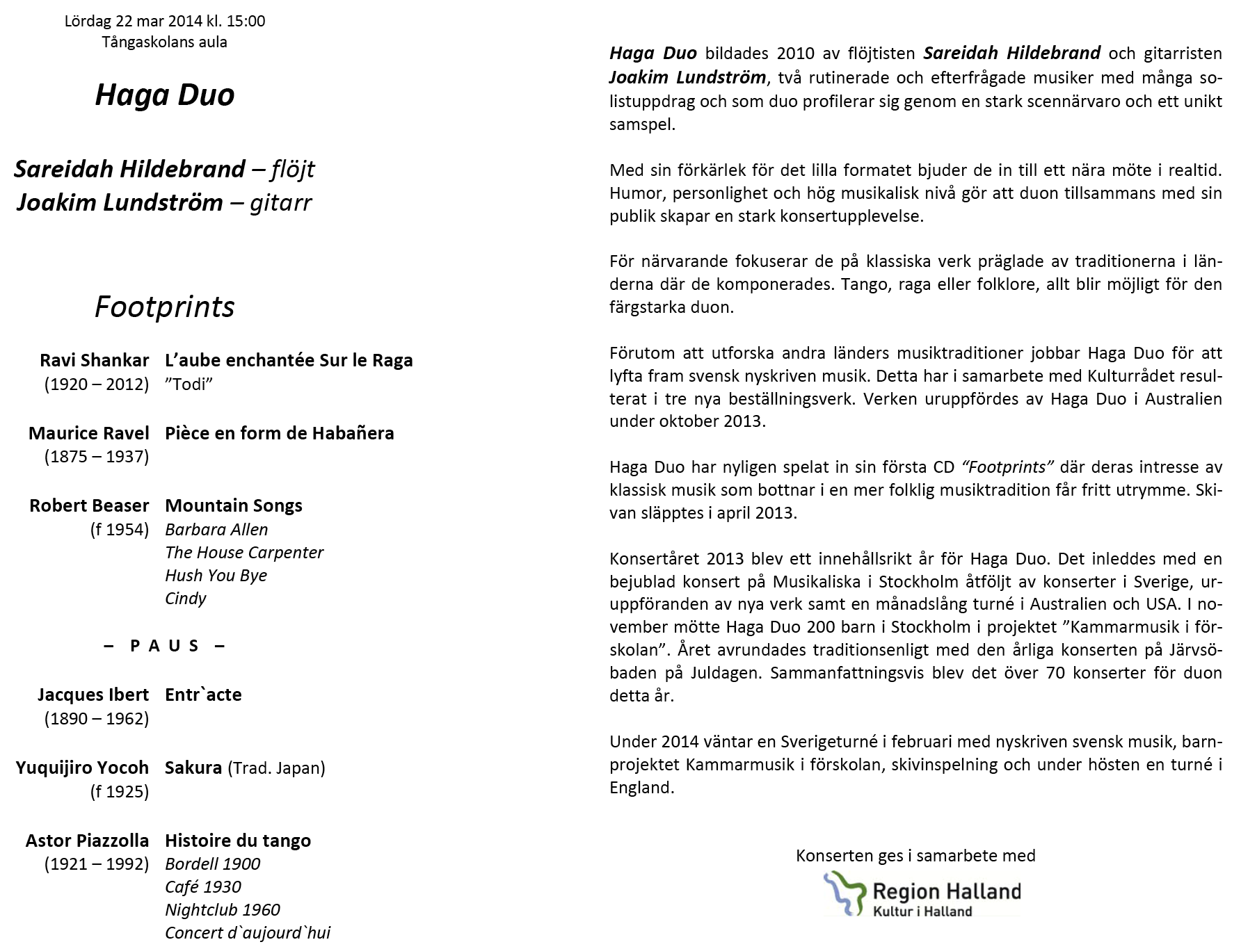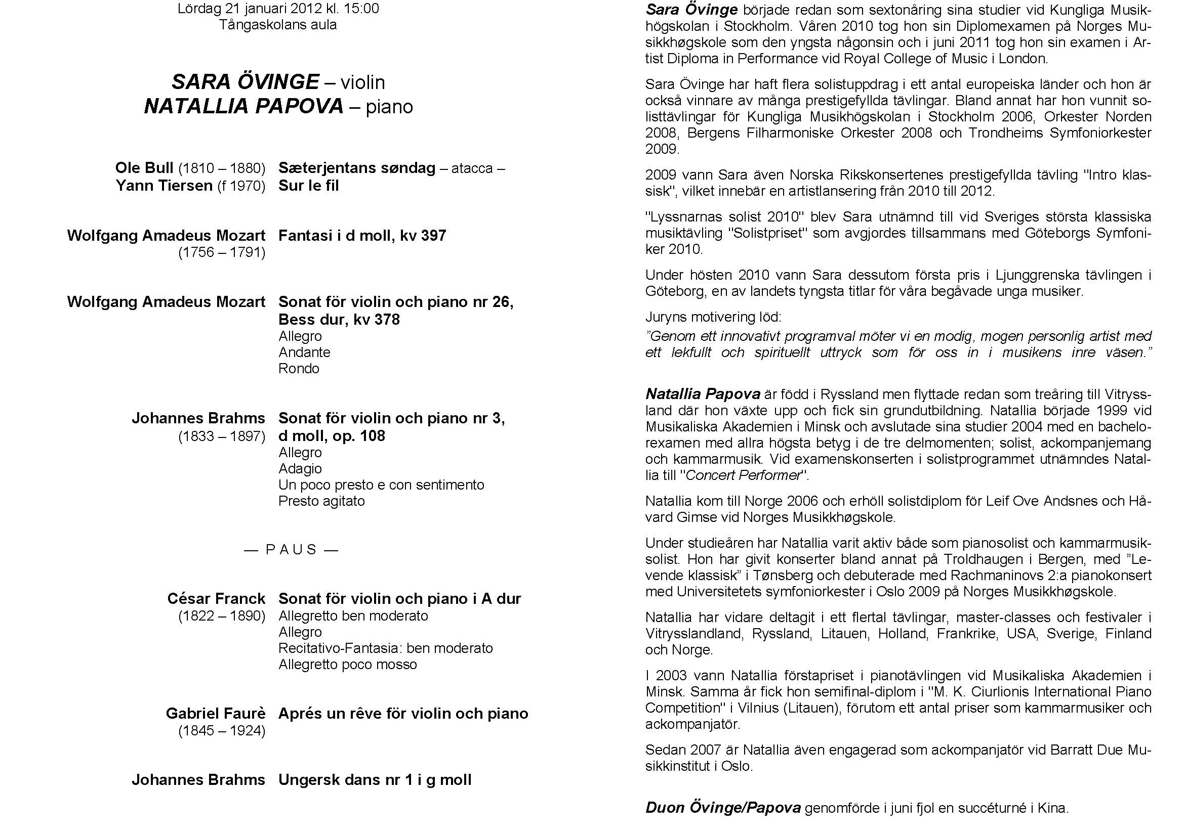 Sara Övinge, Natallia Papova Lördag 21 jan 2012 Tångaskolans aula Program |