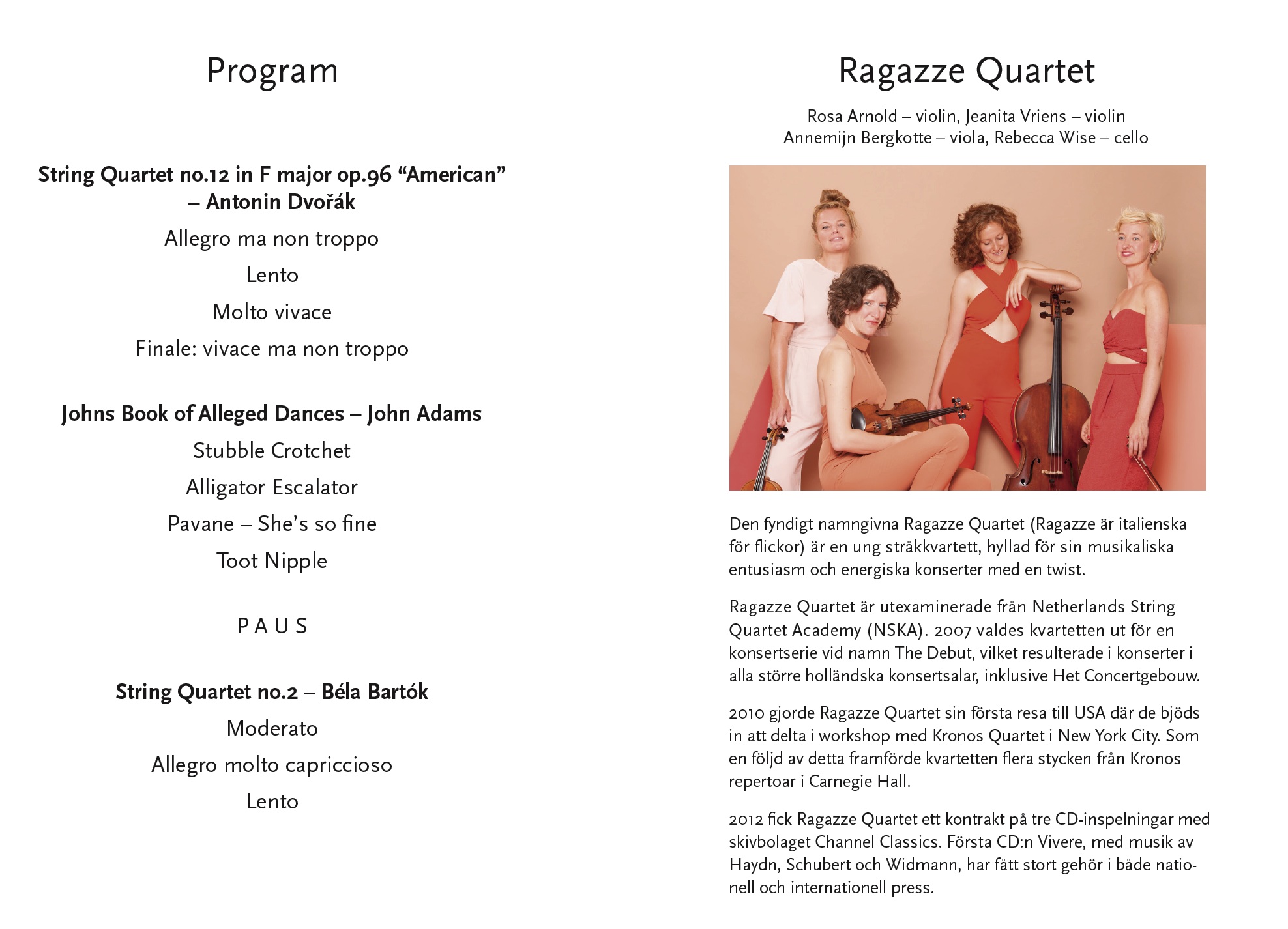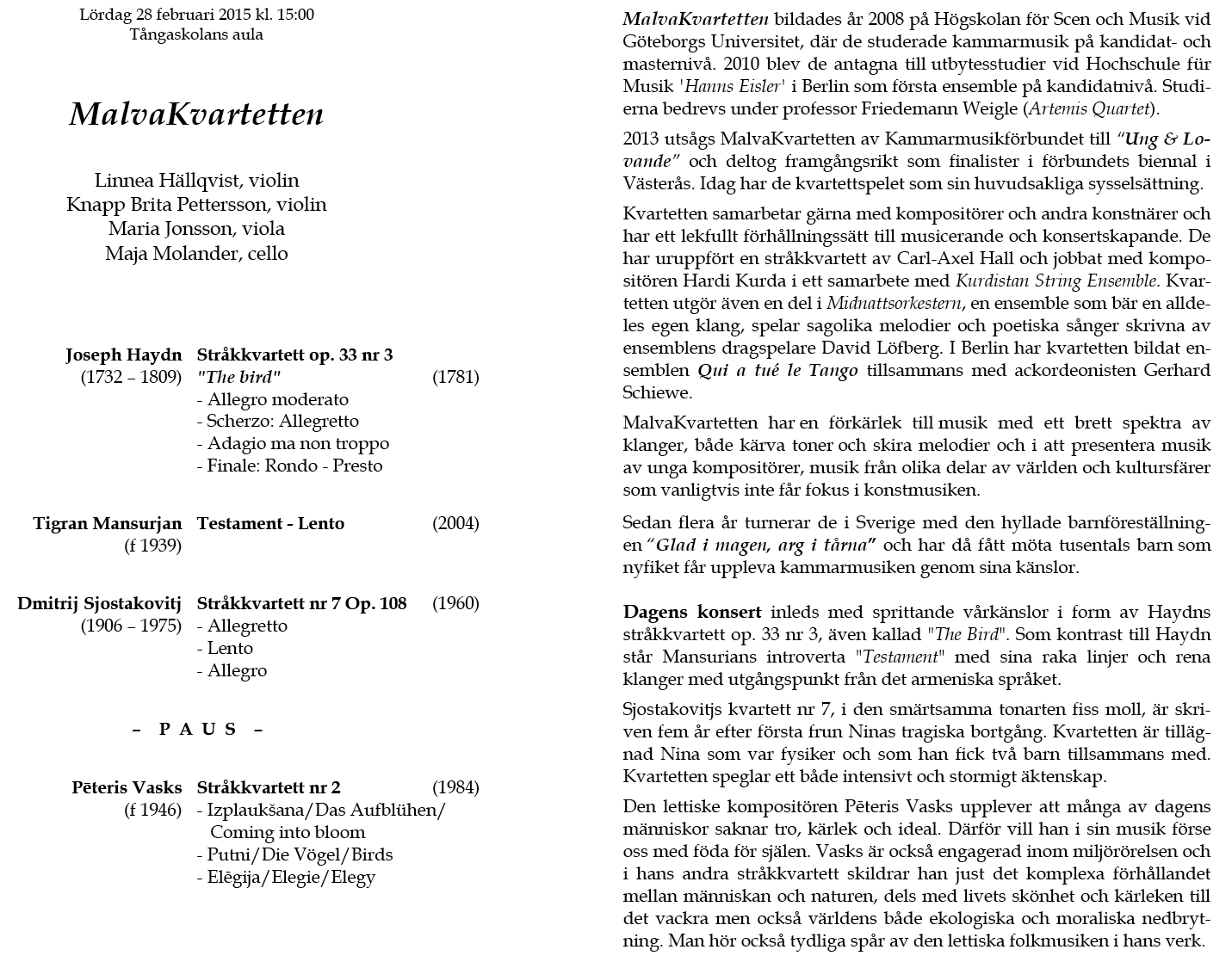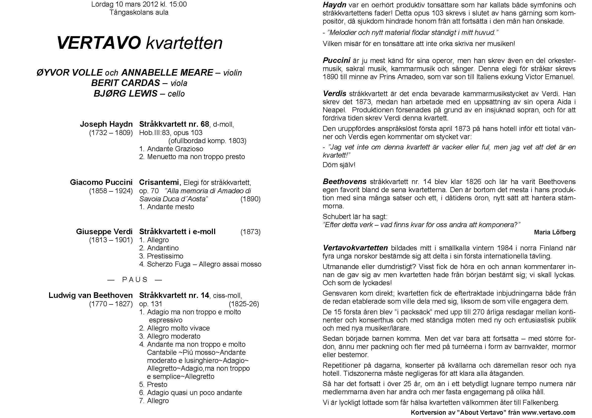 Vertavo kvartetten Lördag 10 mars 2012 Tångaskolans aula Program |