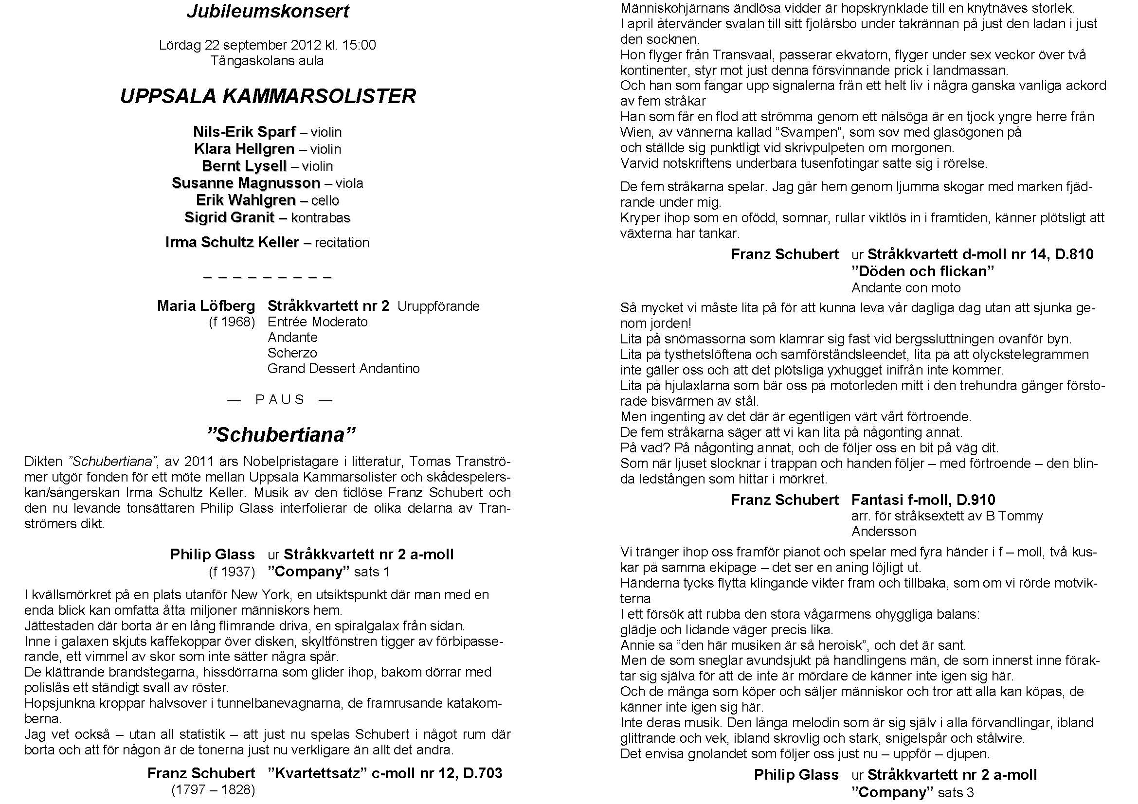 60 års jubileum med Uppsala kammarsolister Lördag 22 september 2012 Tångaskolans aula Program |