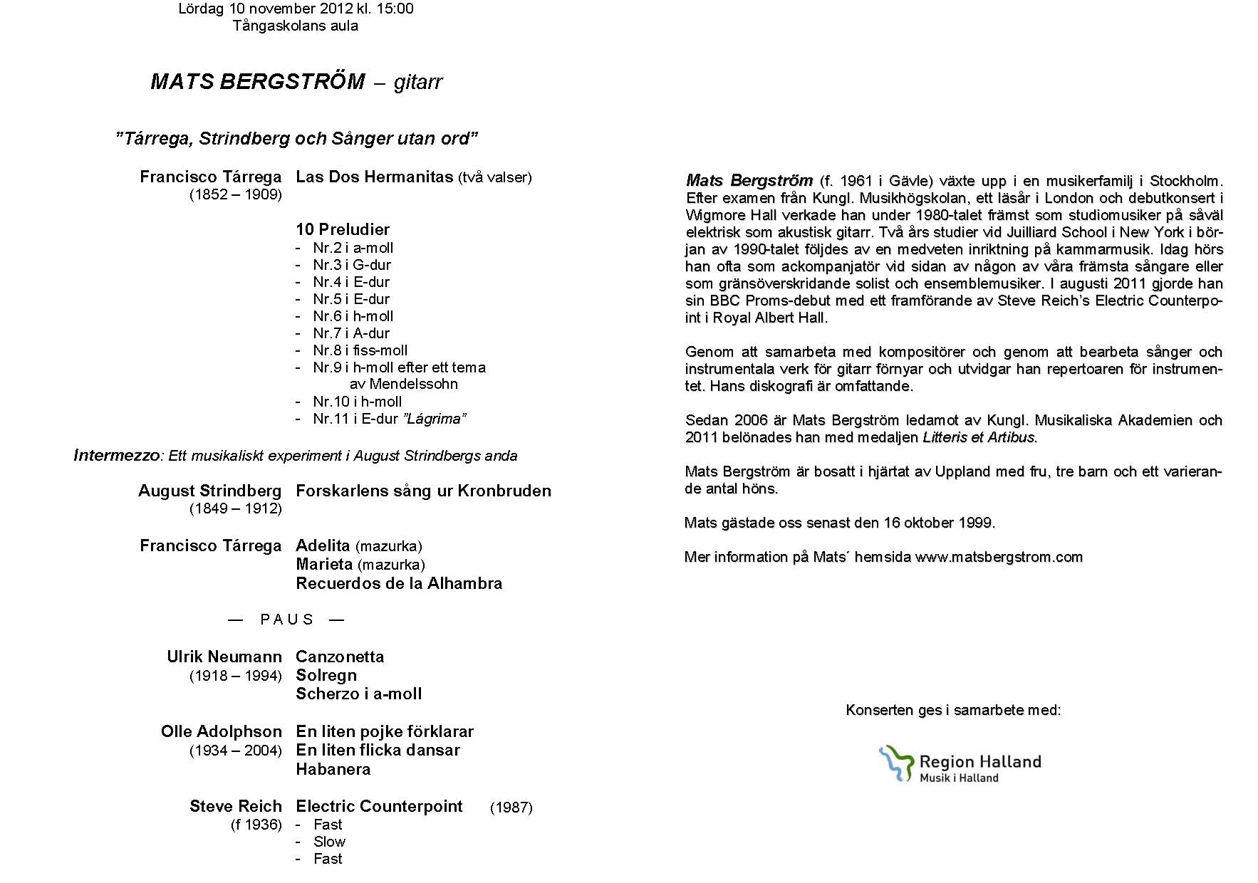 Mats Bergström Lördag 10 november 2012 Tångaskolans aula Program |