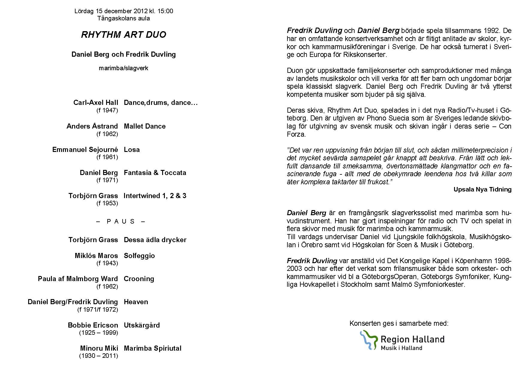 Rhytm Art Duo Lördag 24 november 2012 Tångaskolans aula Program |