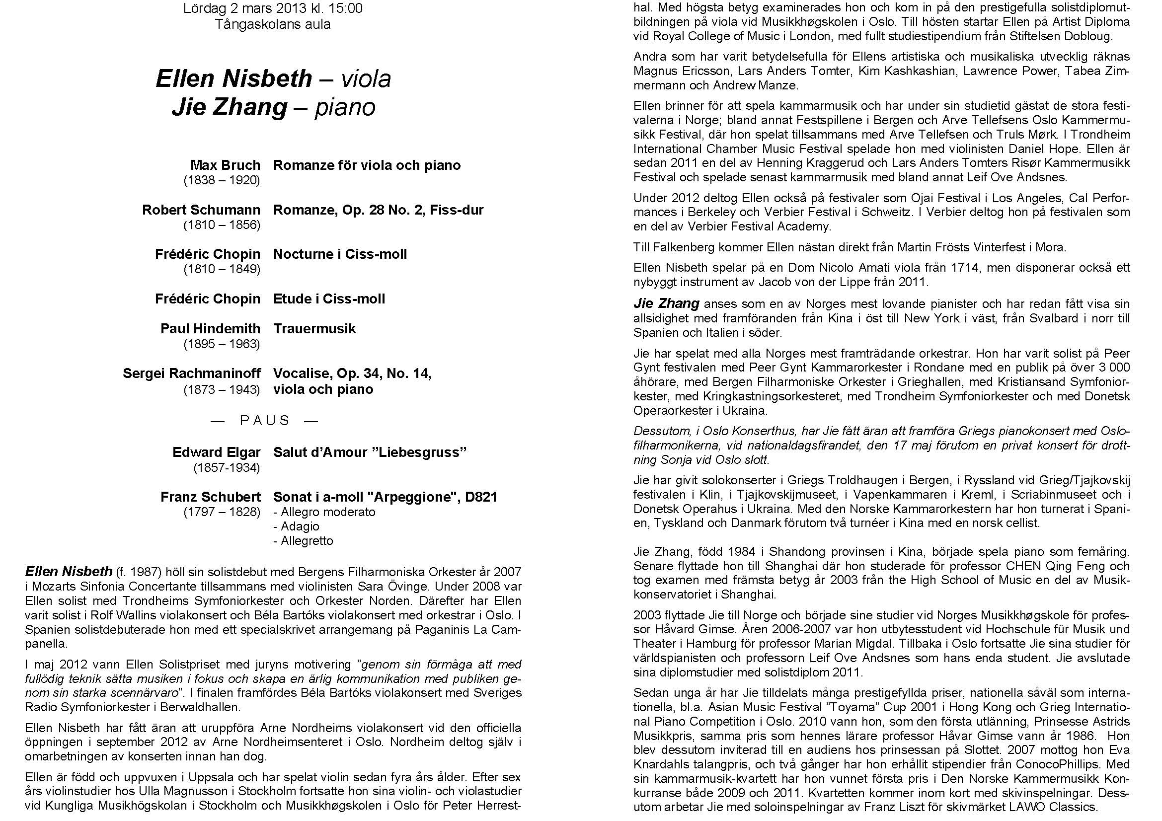 Nisbeth - viola , Jie Zhang - piano Lördag