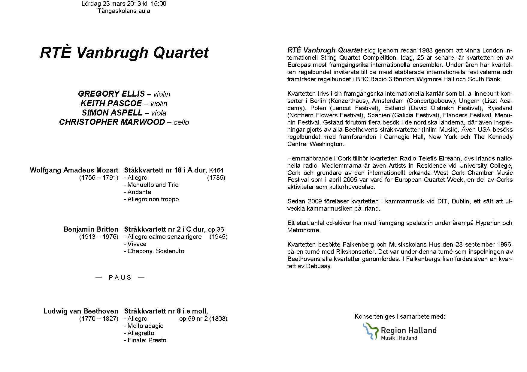 RTÉ Vanbrugh Quartet Lördag 23 mars 2013 Tångaskolans aula Program |