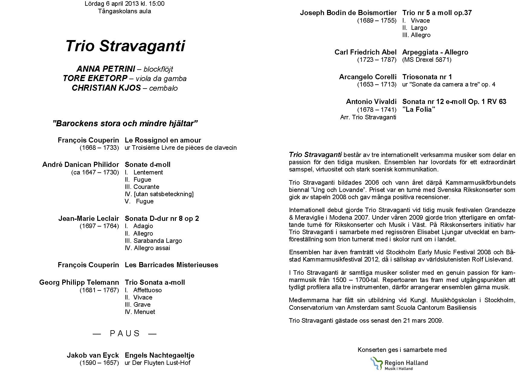 Trio Stravaganti Lördag 21 mars 2009 Tångaskolans aula Anna Petrini - blockflöjt, Tore Eketorp - viola da gamba, Christian Kjos - cembalo |