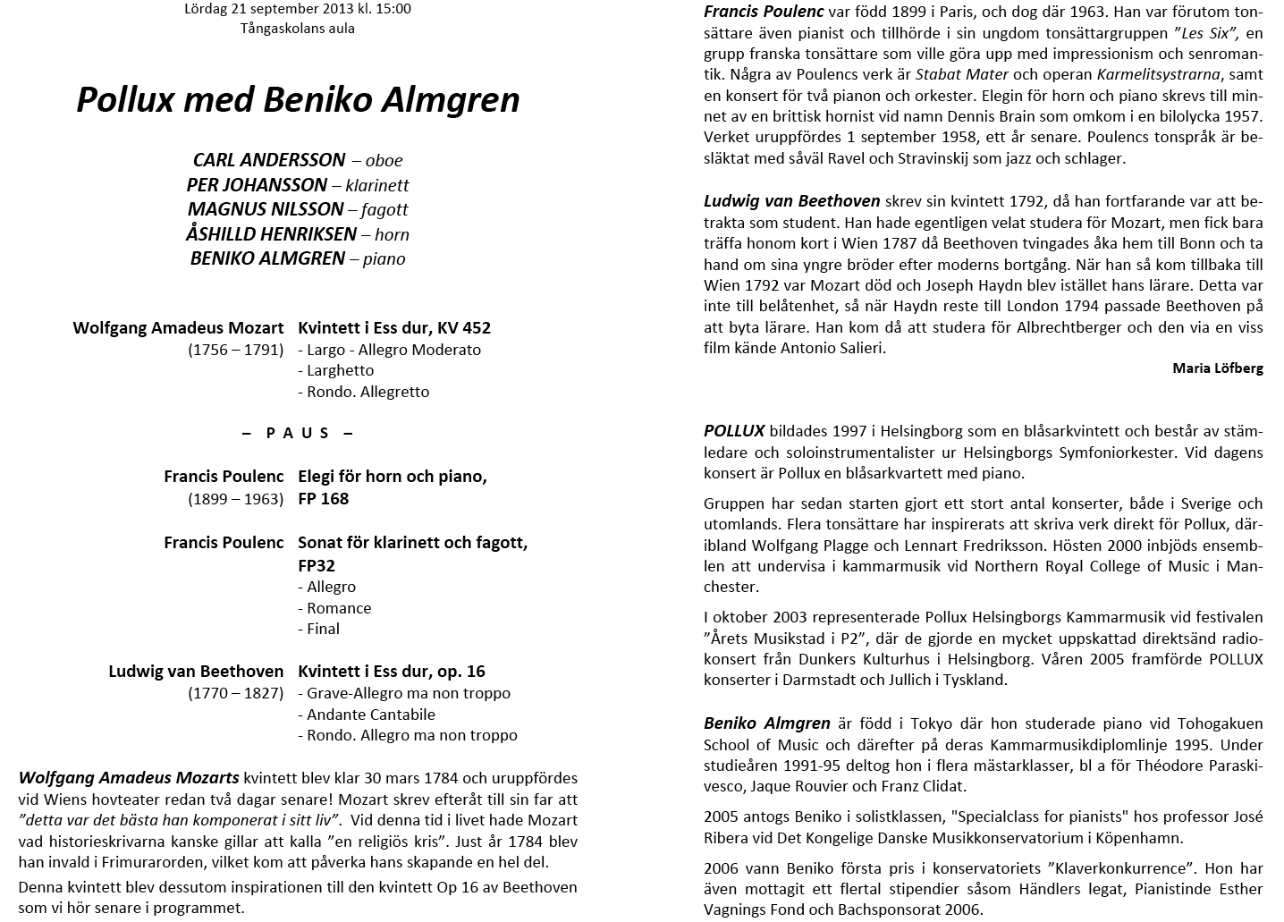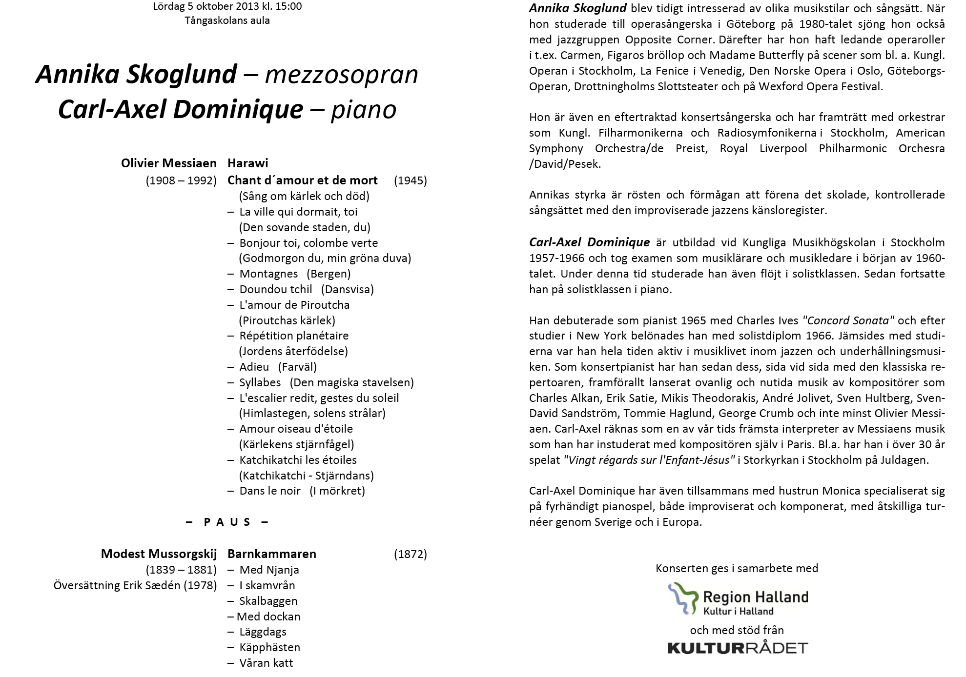 Annika Skoglund & Carl-Axel Dominique Lördag 5 oktoberl 2013 Tångaskolans aula Program |