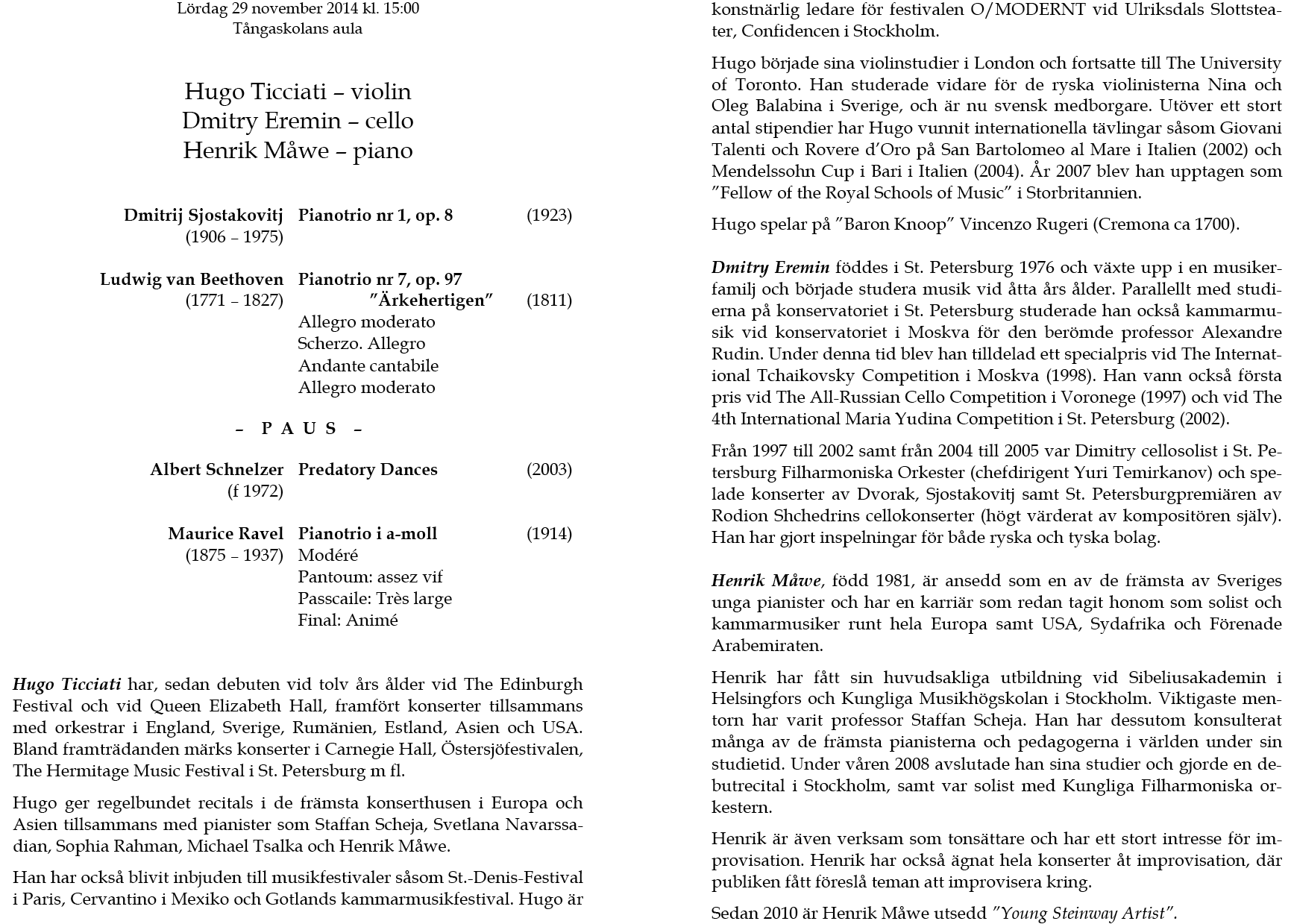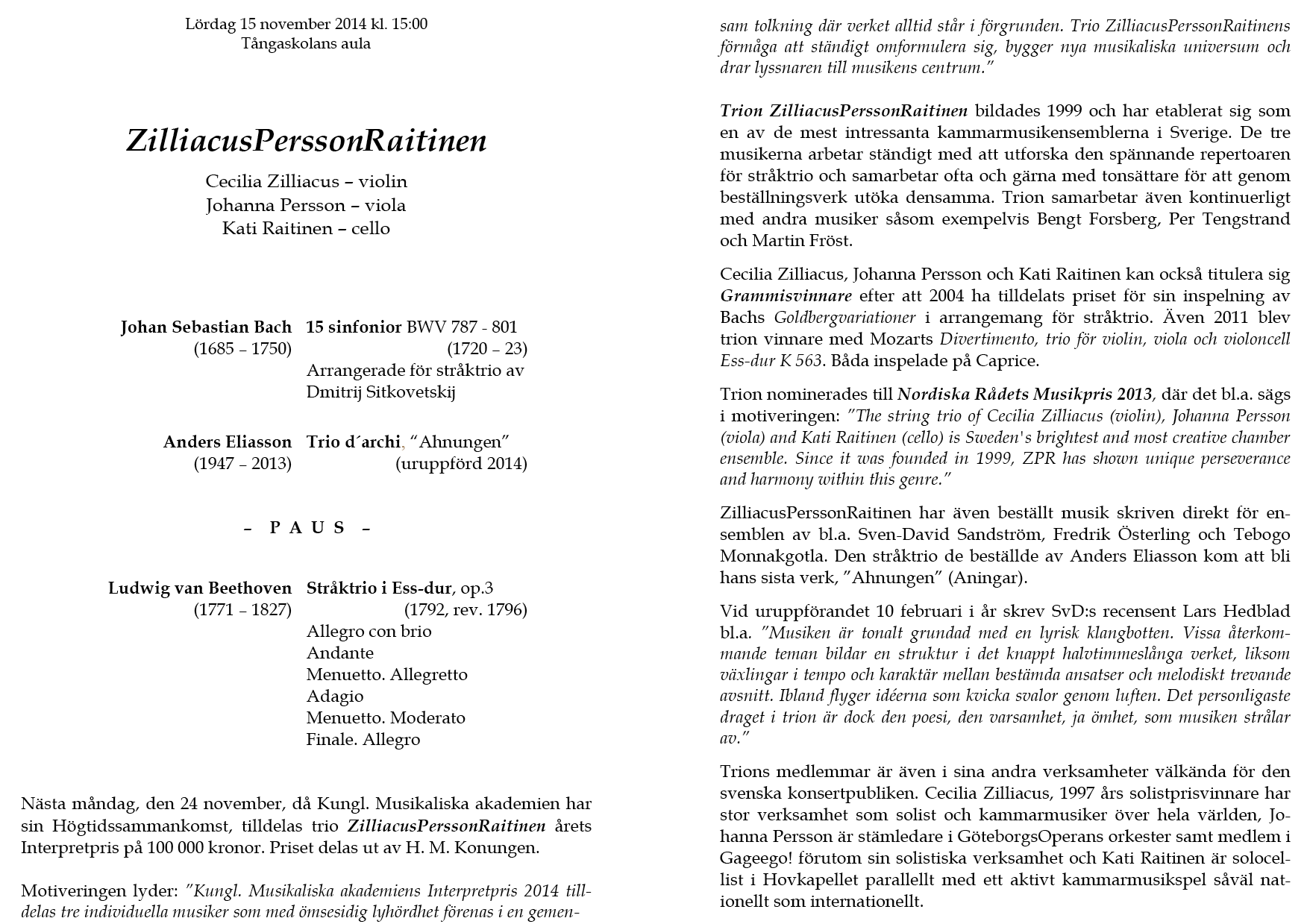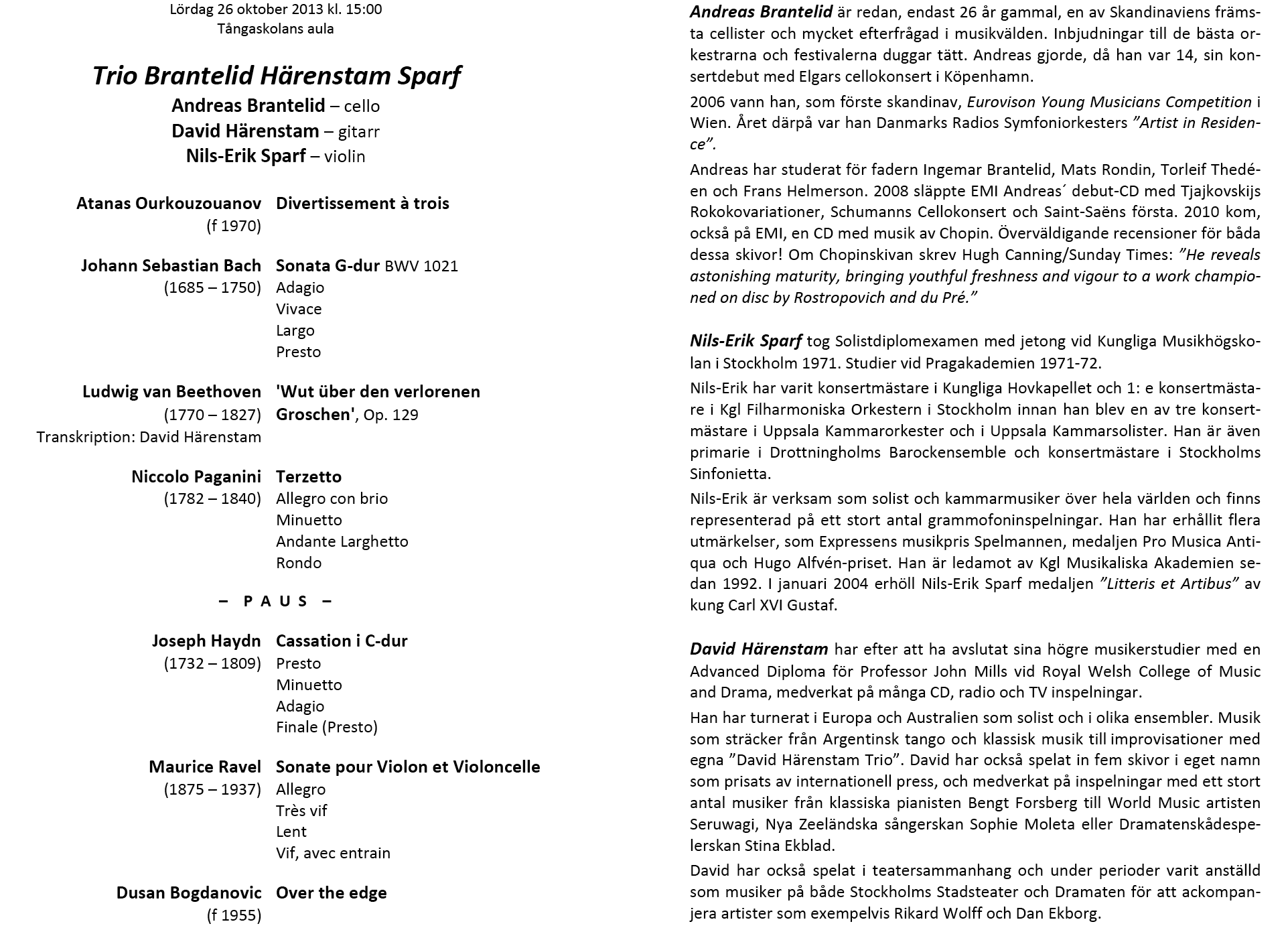 Trio Brantelid Härenstam Sparf Lördag 6 oktoberl 2013 Tångaskolans aula Program |