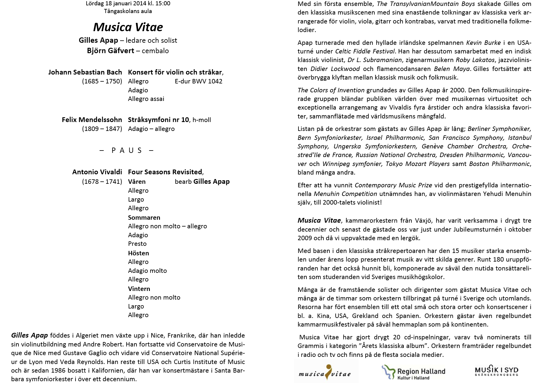 Musica Vitae Lördag 17 oktober 2009 Tångaskolans aula Dirigent - Peter Manning, Violinsolist - Ulf Wallin. Musikskolans ungdomar i foajen före konserten och familjen Johansson får ett tack för traditionen med den fina fikaserveringen under pausen. |