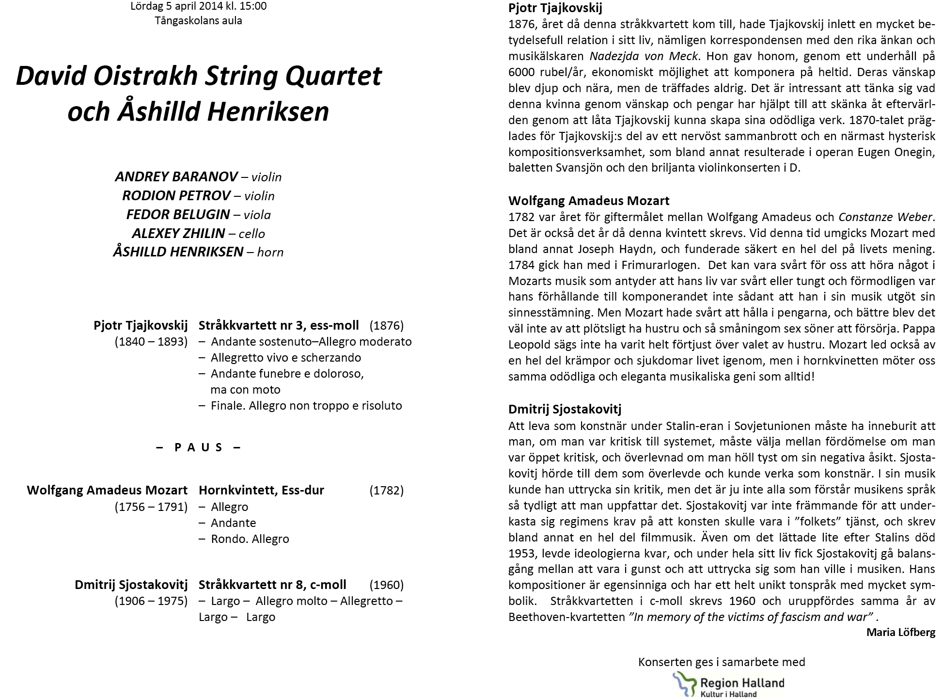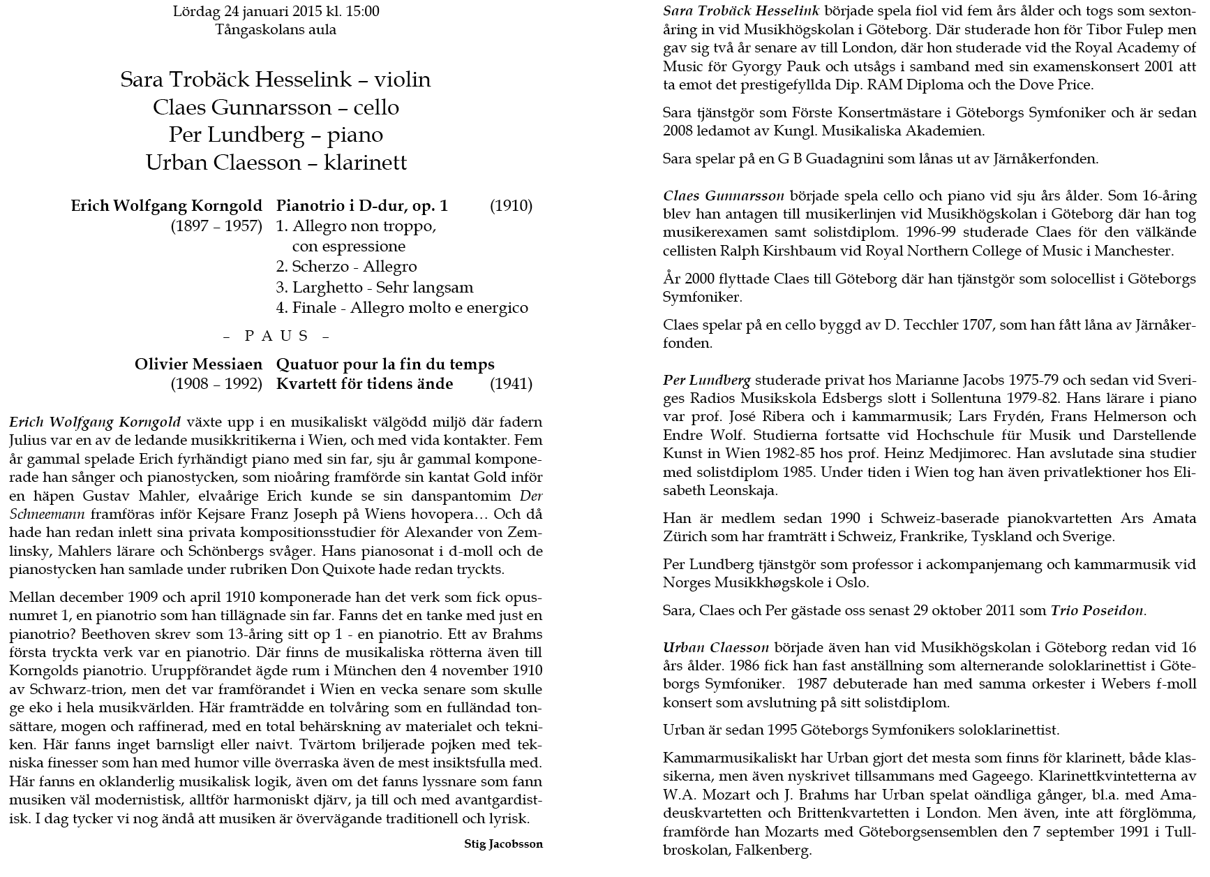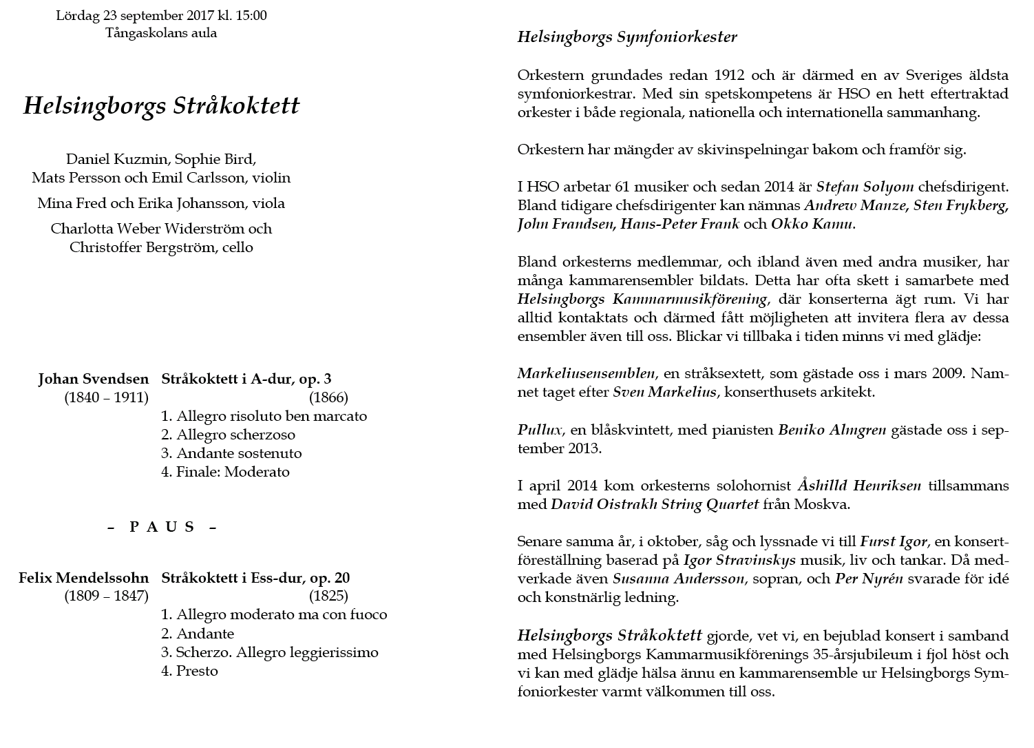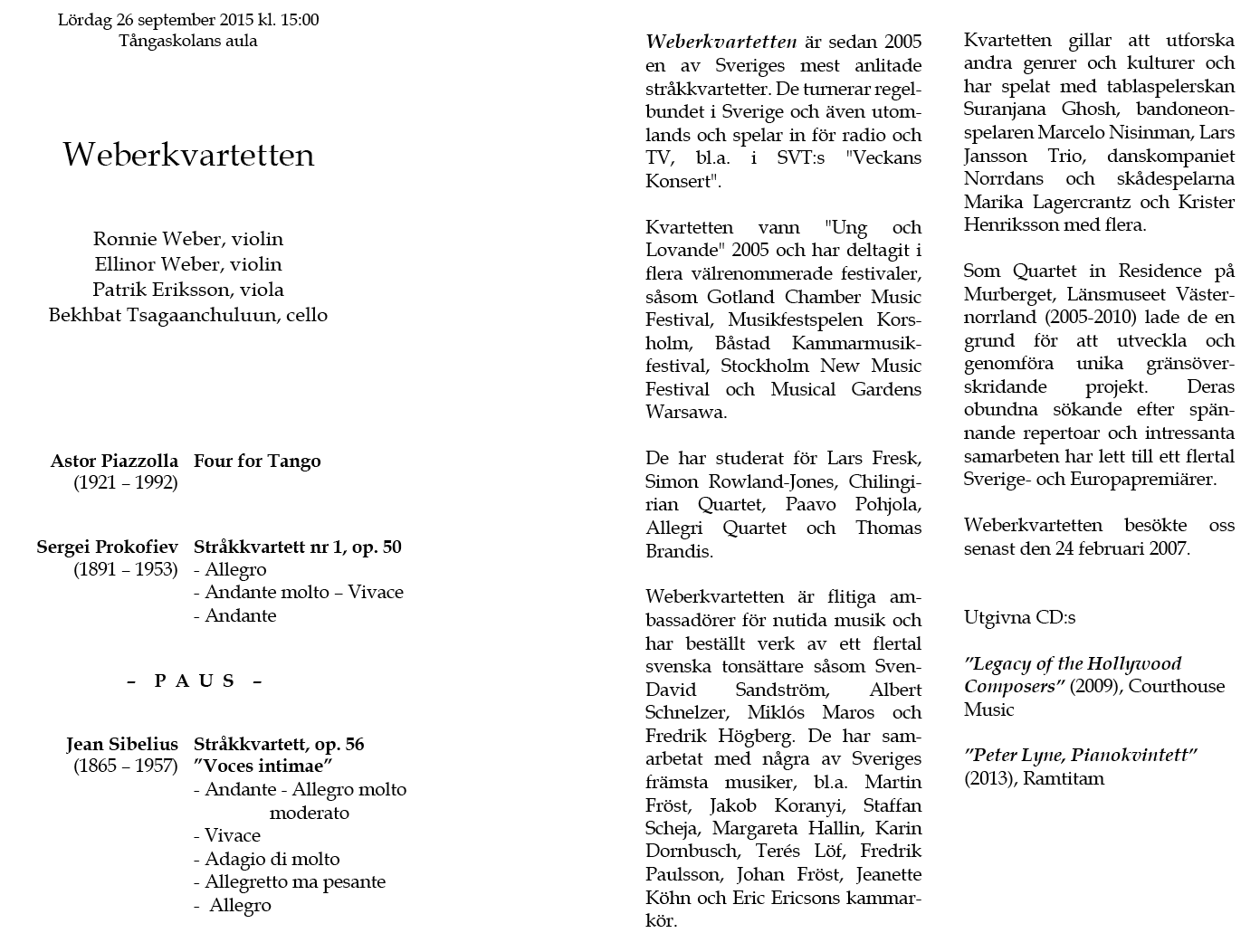 Quartet Lördag 4 februari 2017 Tångaskolans aula Program