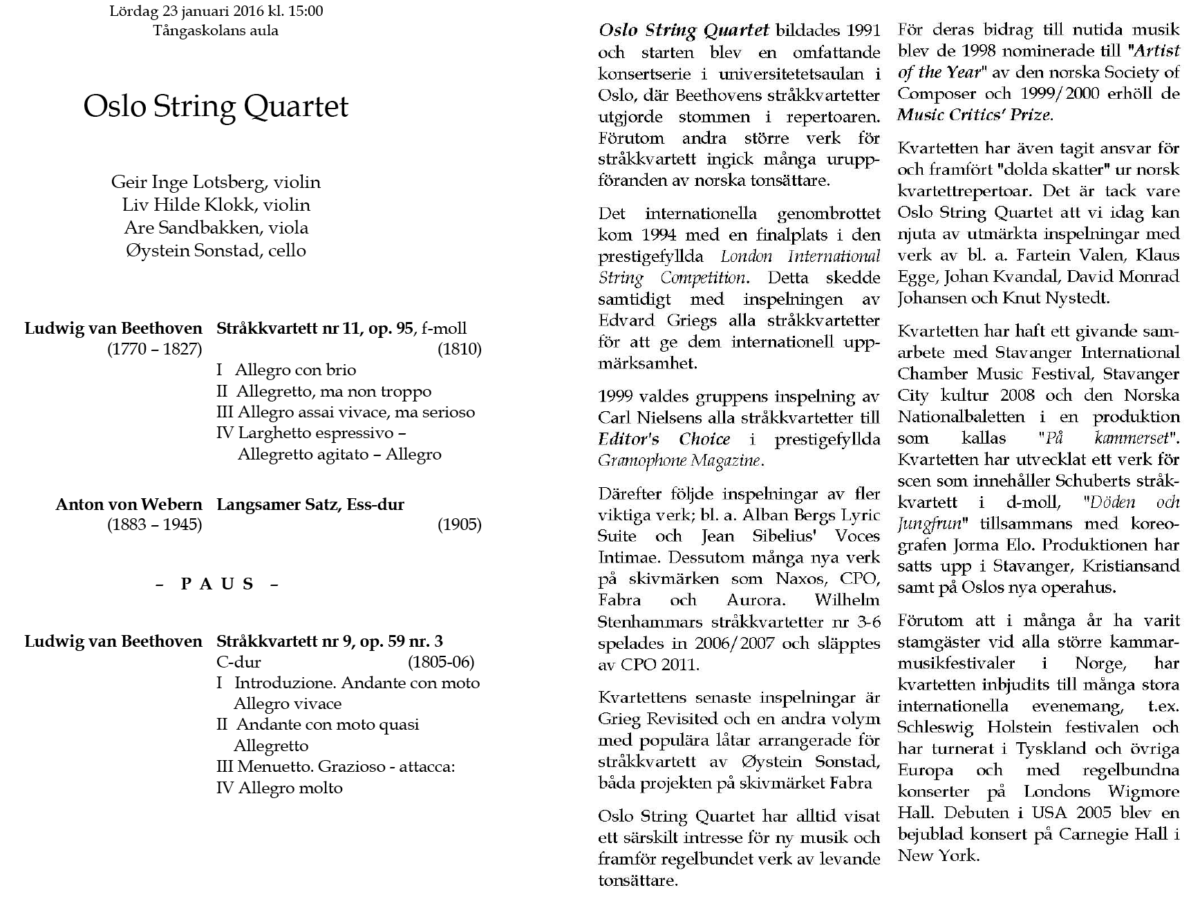 String Quartet Lördag 23 januari 2016 Tångaskolans aula Program |