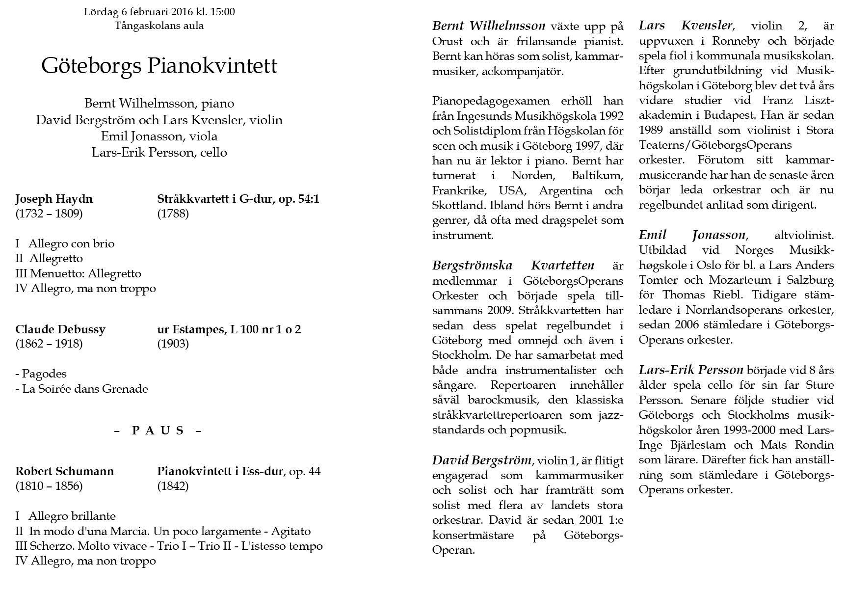 Pianokvintett Lördag 6 februari 2016 Tångaskolans aula Program |