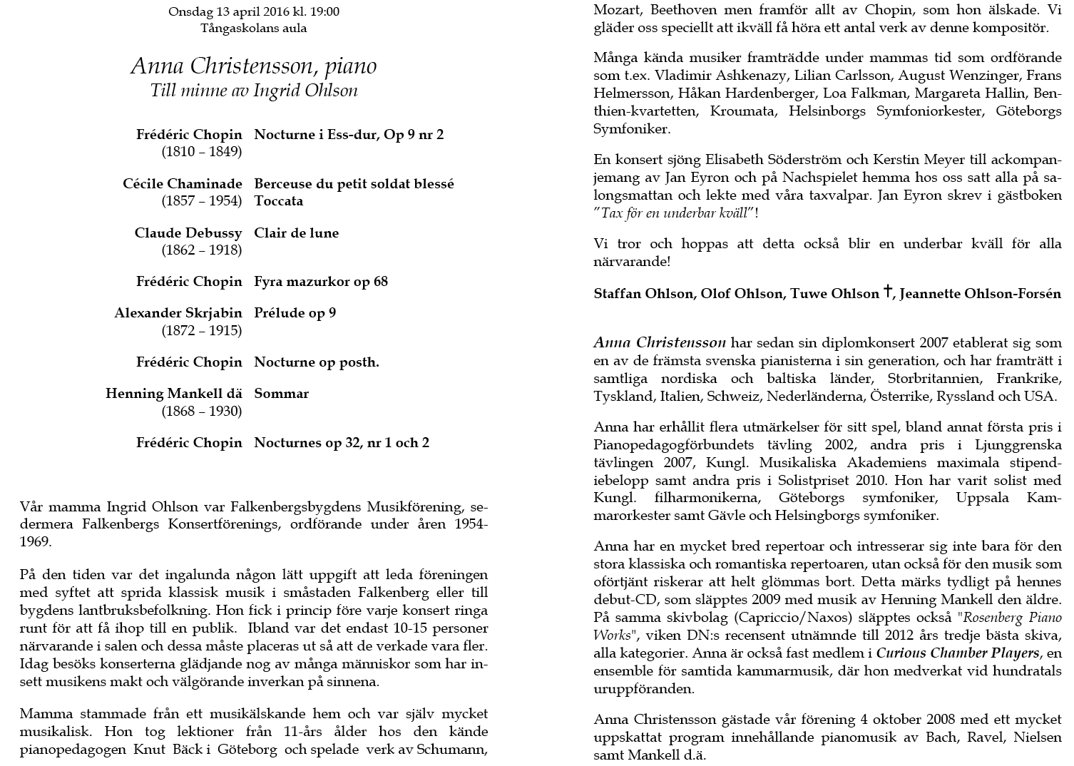 Christensson, piano. Till minne av Ingrid Ohlson Onsdag 13 april 2016 Tångaskolans aula Program |