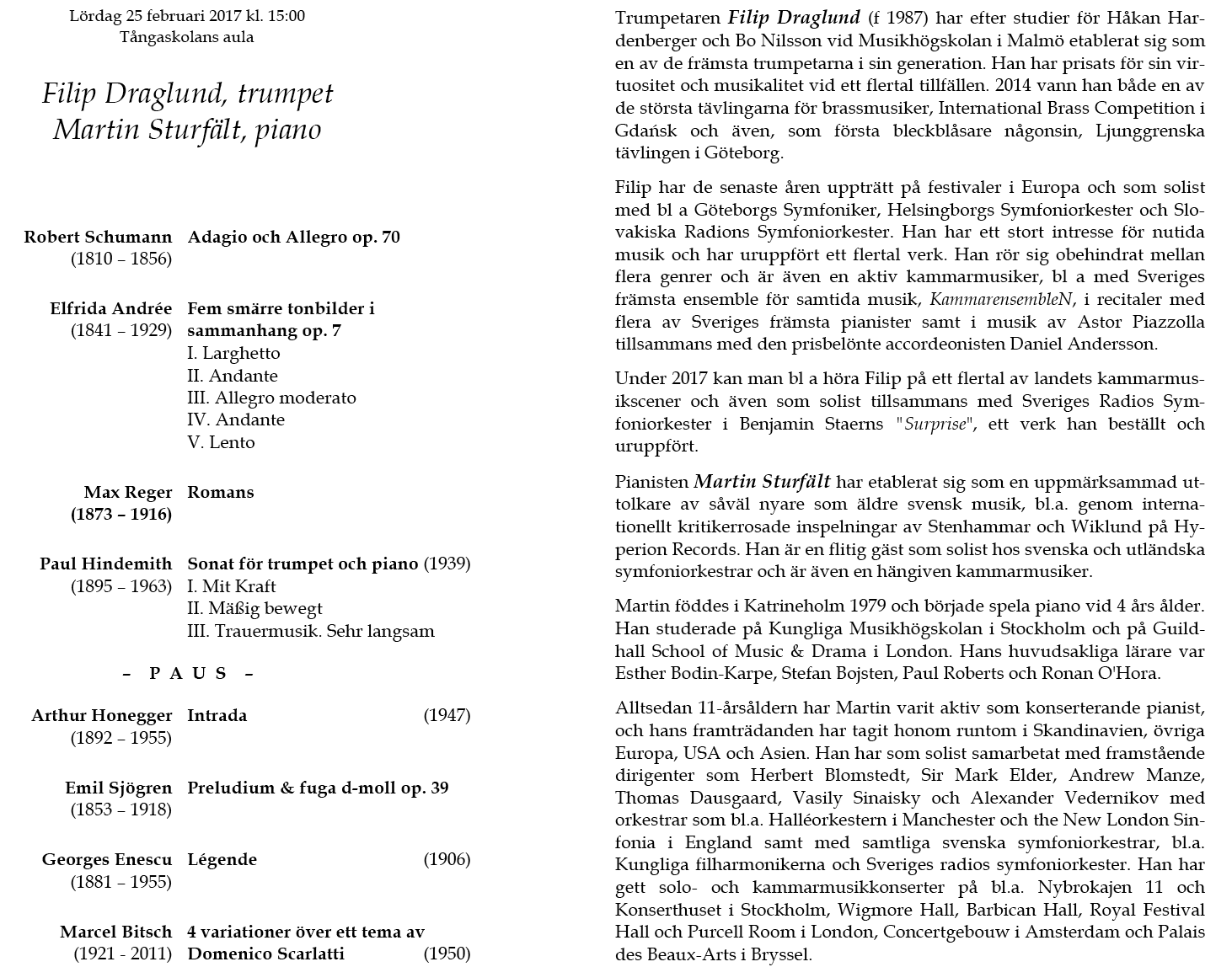 Draglund & Martin Sturfält Lördag 25 februari 2017 Tångaskolans aula Program |