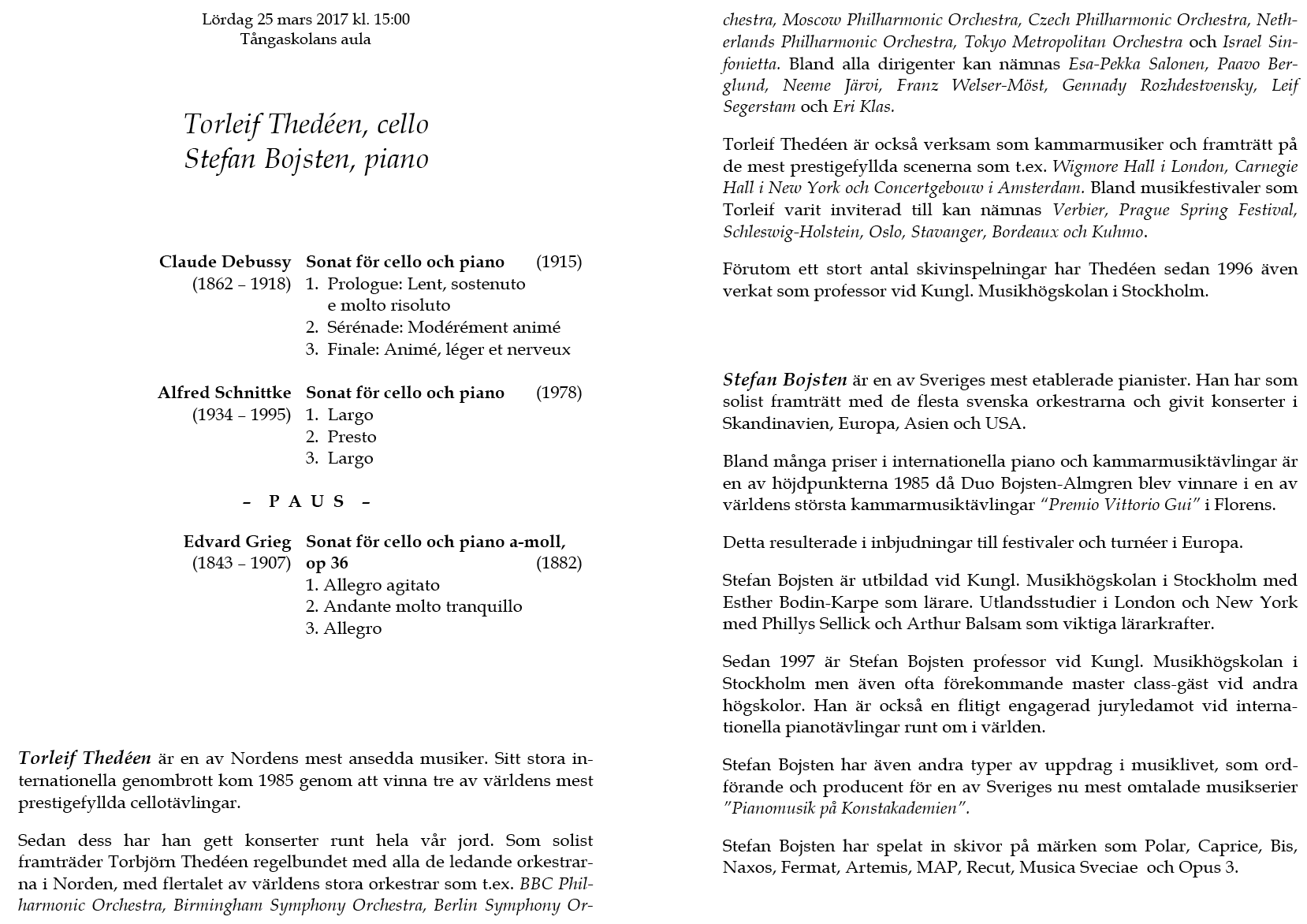 Thedéen & Stefan Bojsten Lördag 25 mars 2017 Tångaskolans aula Program |