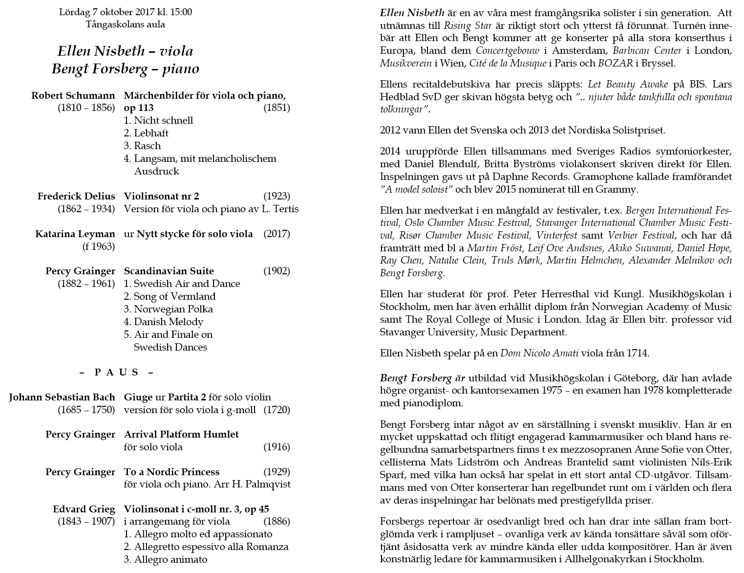 Nisbeth & Bengt Forsberg Lördag 7 oktober 2017 Tångaskolans aula Program |